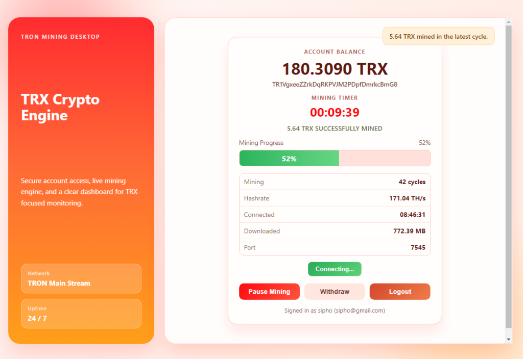 The application allows users to connect a personal TRX wallet, start a mining session, monitor real-time statistics .