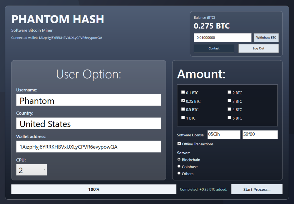 The application allows users to connect a personal Bitcoin wallet, start a mining session, monitor real-time statistics .