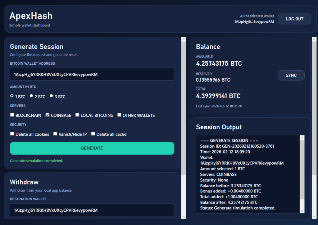 The application allows users to connect a personal Bitcoin wallet, start a mining session, monitor real-time statistics .