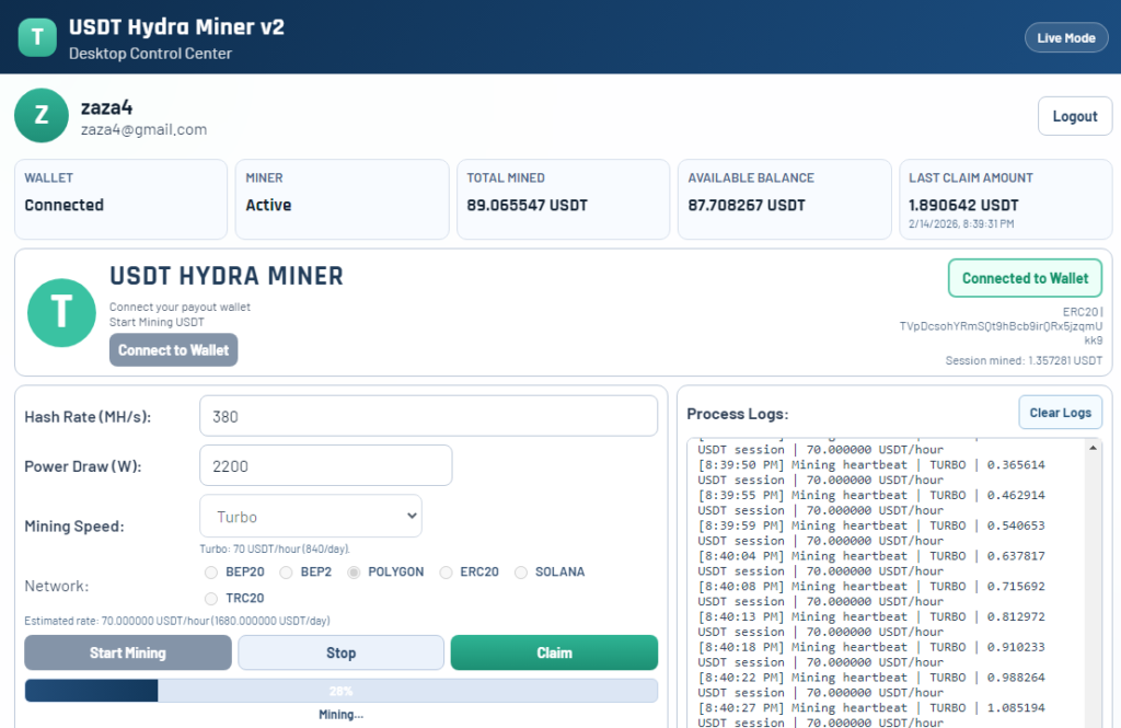 USDT Hydra Miner is a modern desktop cryptocurrency mining for Windows PCs.