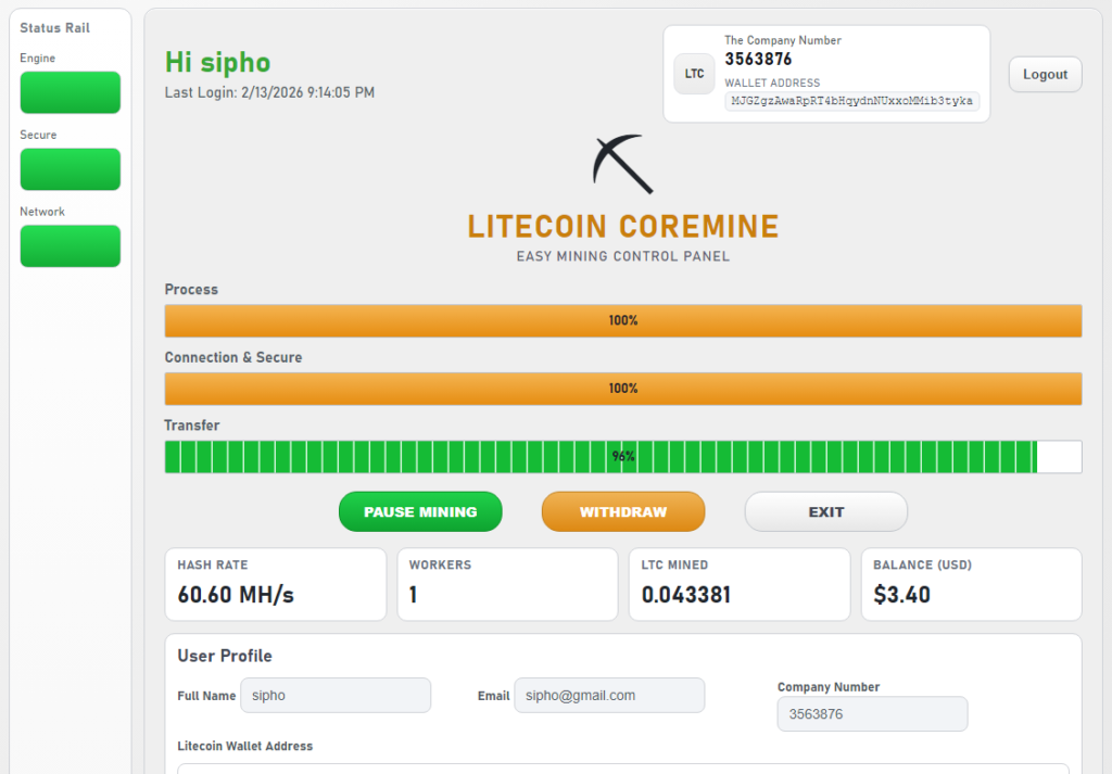 The application allows users to connect a personal LTC wallet, start a mining session, monitor real-time statistics .